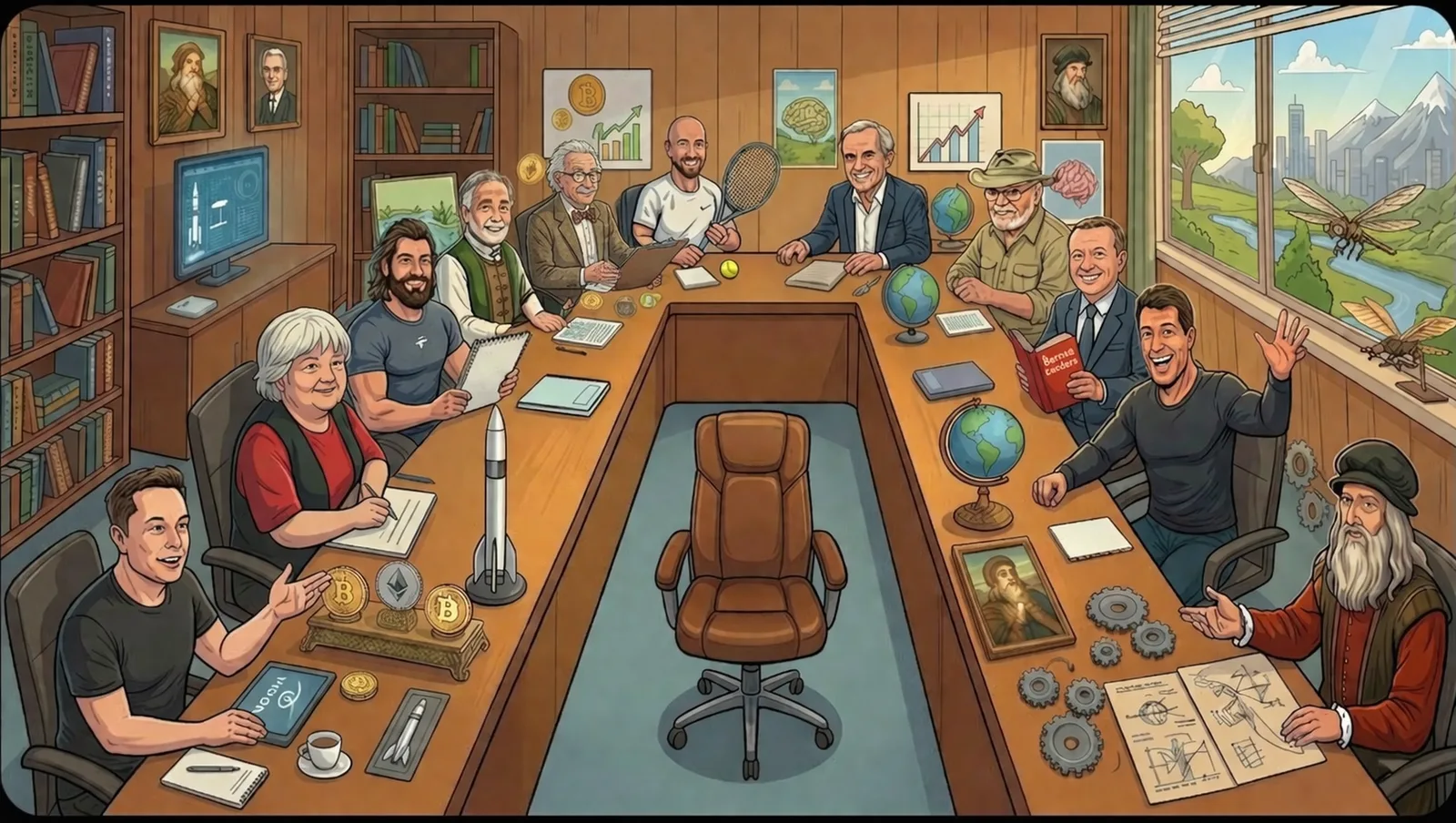 Es ist im Grunde ein mentaler Hack für dein Unterbewusstsein. Du baust dir in deinem Geist einen festen Raum – zum Beispiel einen U-förmigen Tisch – an dem 12 von dir handverlesene Persönlichkeiten sitzen. Jeder dieser Ratgeber repräsentiert eine absolute Koryphäe auf einem bestimmten Gebiet: von radikalem Wachstum und Makroökonomie über gehirn-gerechtes Denken bis hin zu physischer und mentaler Resilienz.