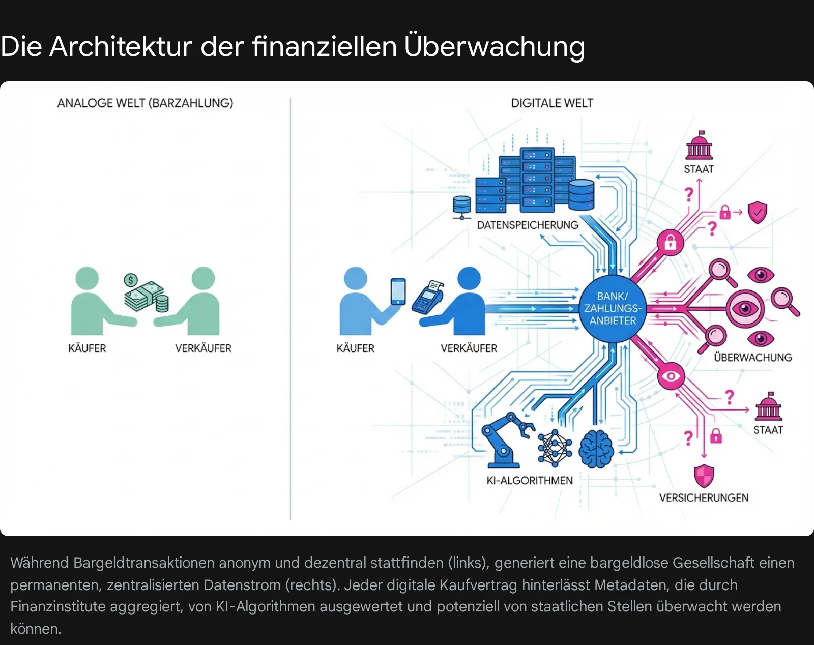 - Jede bargeldlose Zahlung erzeugt Datenpunkte, die zu Profilen, Bewertungen und potenziell zu Kontrolle oder Ausschluss führen können.
